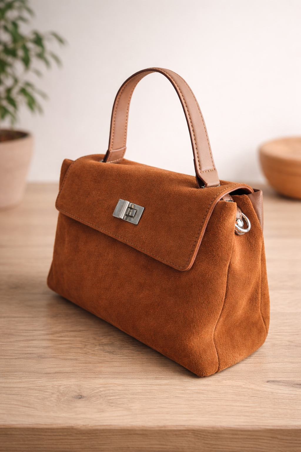 Julia is zo’n tas die moeiteloos past bij elke dag. Zacht suède, rustige lijnen en een vorm die subtiel meebeweegt zonder haar elegantie te verliezen. Het handvat heeft een klassieke uitstraling, terwijl de zilveren sluiting voor een moderne balans zorgt.